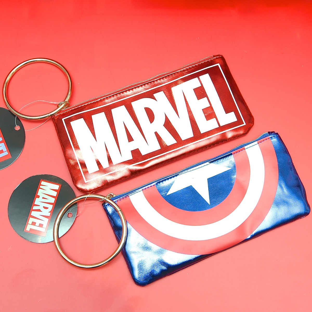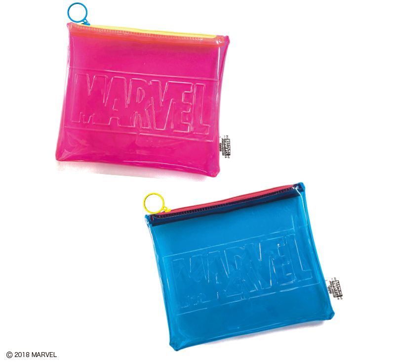 クリアタイプで中身が確認しやすい、水濡れにも強いビニールポーチには「MARVEL」のボックスロゴをプリント。