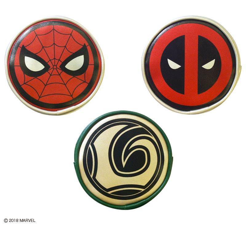 「スパイダーマン」と「デッドプール」のポップな顔型と「ロキ」のエンブレムが落とし込まれた、携帯に便利なアイテムです。