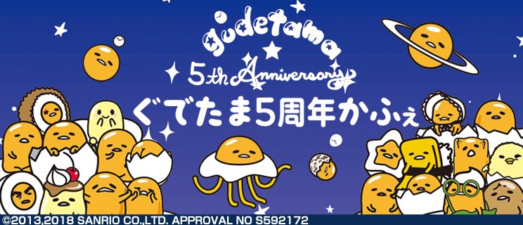 サンリオの大人気キャラクター「ぐでたま」の5周年を記念して、宇宙に飛び出した感たっぷりの「ぐでたま5周年かふぇ」を期間限定でオープン!