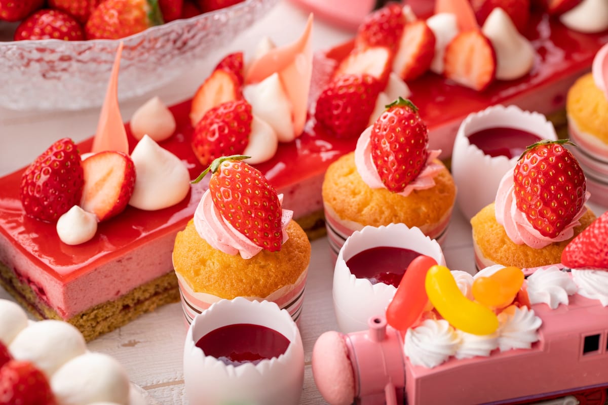 この他にも、チョコレートムースケーキ、イチゴとピスタチオのダックワーズ、ゴジラ足型クッキー、「モスラ」の卵ムースヨーグルト味、イチゴマシュマロ、アセロラとイチゴのゼリー、イチゴのソフトクリーム(チョコチップなどを自由にデコレーションし、サンデー風に楽しめます)など約20種類のデザートを楽しむことができます☆