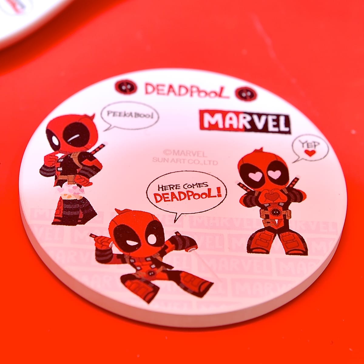 自己中で無責任な“R指定”ヒーロー「デッドプール」がかわいいデザインされた「サンアート」のグッズ。