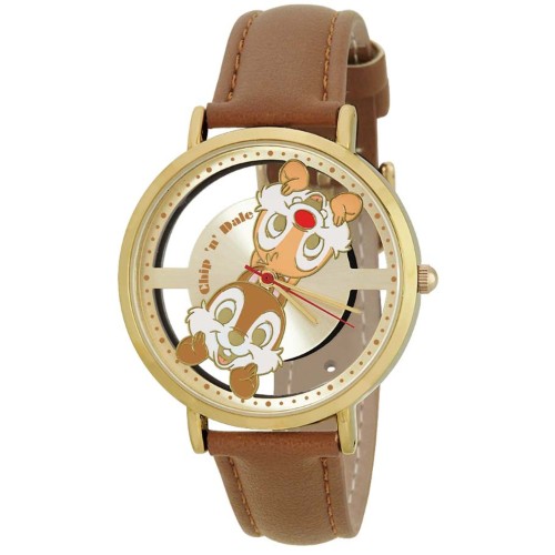 頬杖をついてにっこりと笑顔を浮かべる「チップ&デール」デザインの腕時計。