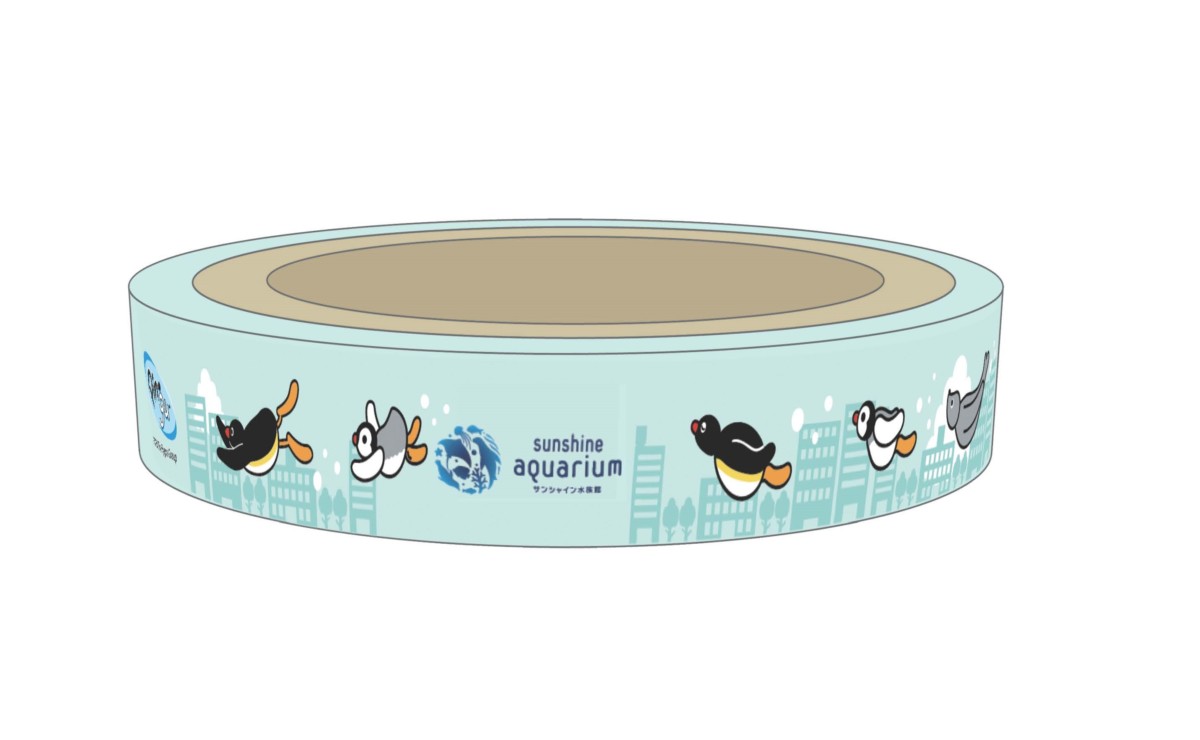 「天空のペンギン」水槽をイメージして、ピングー、ピンガ、ロビが空を飛んでいるようなデザインがとてもおしゃれなオリジナルデザインのマスキングテープです。
