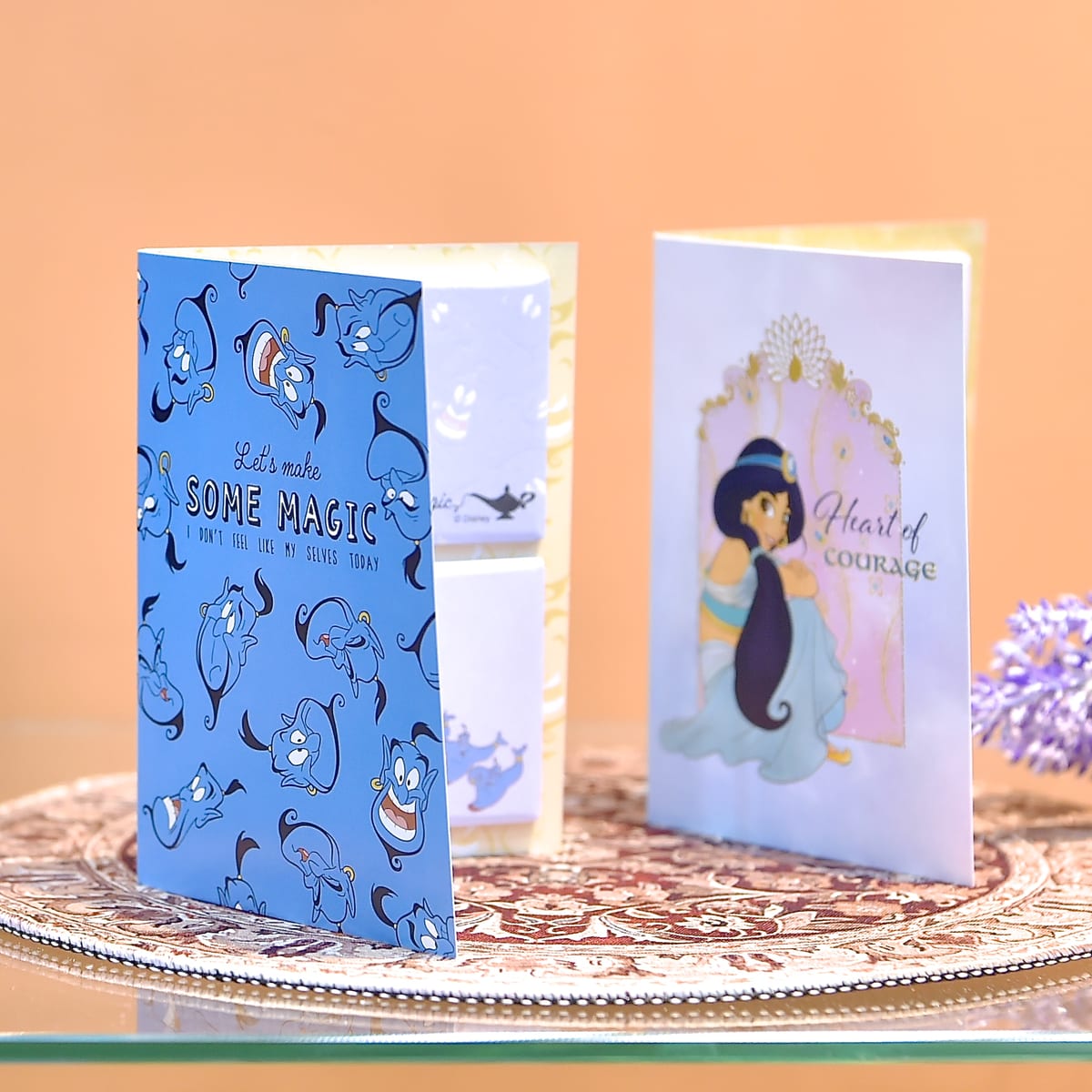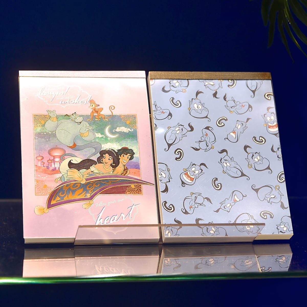 表紙にディズニープリンセス「ジャスミン」と、「ジーニー」が描かれているミニサイズのメモ帳。