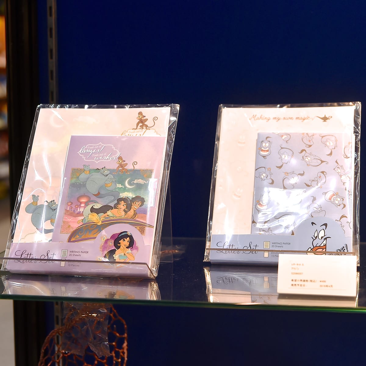 魔法の絨毯に乗った「アラジン」と「ジャスミン」や、ユニークな「ジーニー」の総柄が描かれたレターセット。