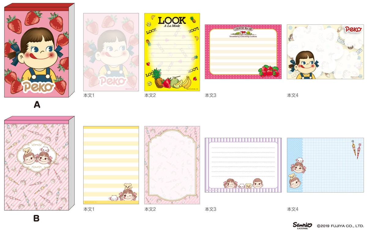 A6サイズのメモ帳は、大きく描かれたペコちゃんとイチゴデザイン(A)と、ペコちゃんとボーイフレンドのポコちゃんデザイン(B)の2種類。