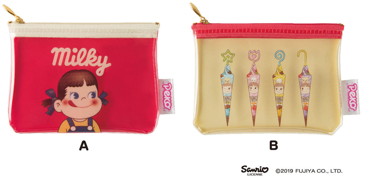 フラットなミニポーチは、ミルキー柄(A)と4本のパラソルチョコレート柄(B)の2種類。