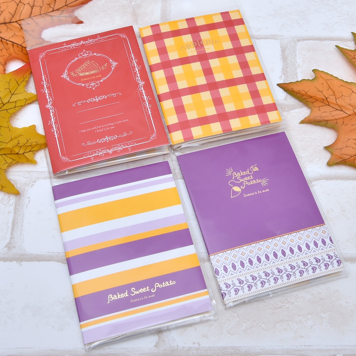 アップルパイのロゴがレトロなレシピ本の表紙のようなデザイン「アップルパイ ロゴ」、アップルパイをイメージした温かみのあるチェック柄「アップルパイ チェック」、ほかほかのベイクドスイートポテトをおしゃれにあしらったロゴマークが特徴の「ベイクドスイートポテト ロゴ」、大人っぽいレトロなマルチボーダー柄「ベイクドスイートポテト ボーダー」の4デザインがラインナップ☆