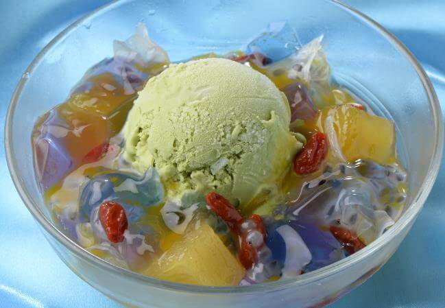 パイナップルコンポート、ココナッツ寒天、白きくらげ、クコの実、山粉圓(サンフンウェン)、マンゴーソース、抹茶アイス、バタフライピーの2色ジュレ(青、紫)で人気の「シノワボウル」をハワイアンバージョンに。