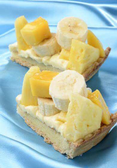 アーモンド香るサクサクのタルトに、甘さ控えめのカスタードクリームと、旬のアップルマンゴー、完熟パイナップル、バナナを贅沢にデコレーション。