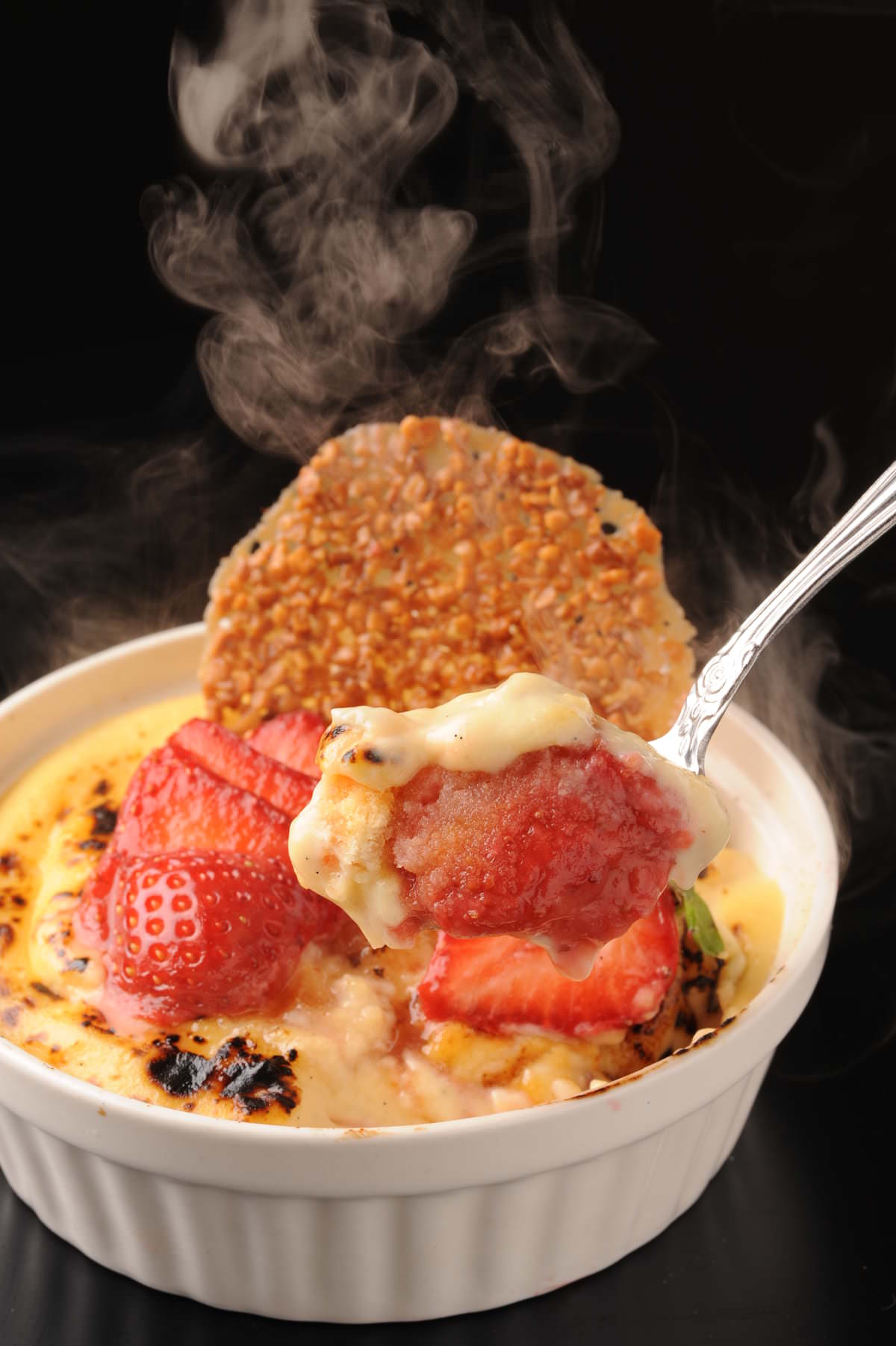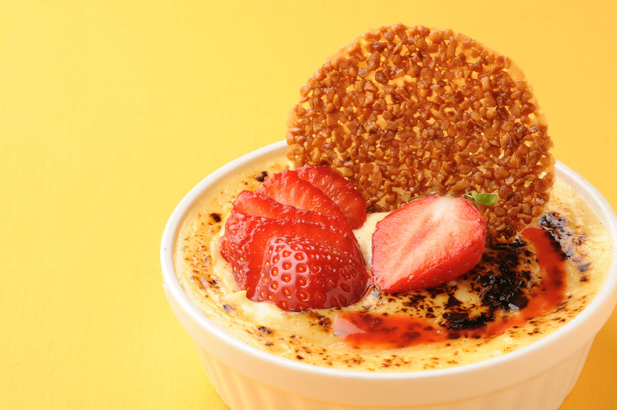 しっとりしたジェノワーズ生地とカスタードクリームに重ね、ご注文ごとにオーブンとバーナーでぐつぐつに焼き上げ、さらにフレーズ(苺)ソースで仕上げられます。