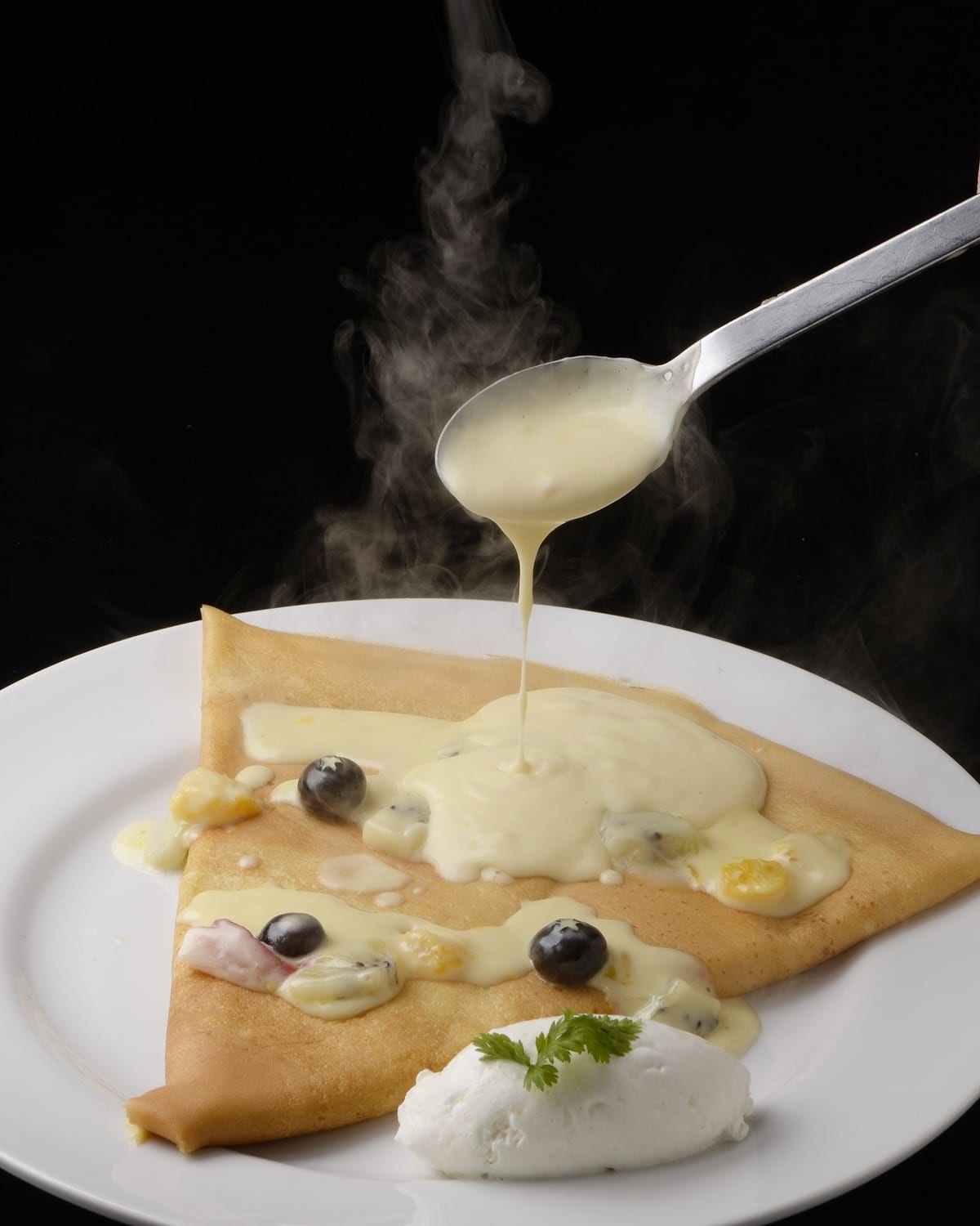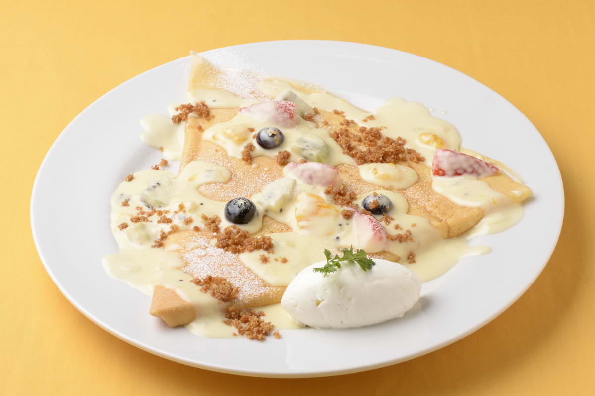 焼きたてのもちもちのクレープ生地に、大山シェフ自慢のカスタードクリームを包み込んだ「フルーツシチュー クレープ」