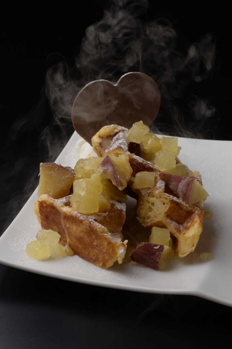 自家製の焼きたてもちふわワッフルにはりんごのコンポート、さつまいもの甘露煮を合わせ、自家製焦がしバターで仕上げられています。