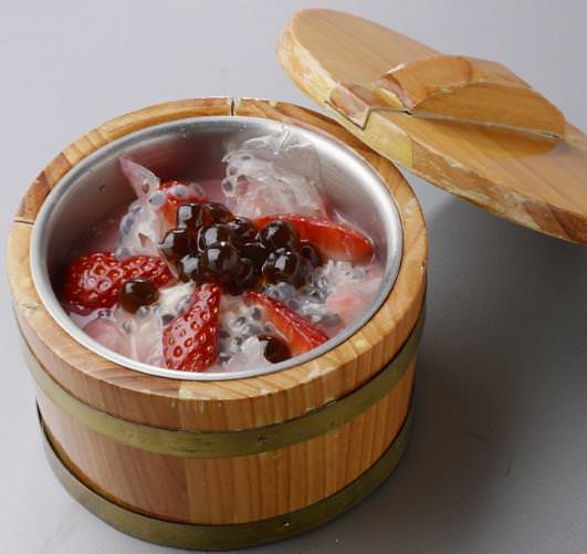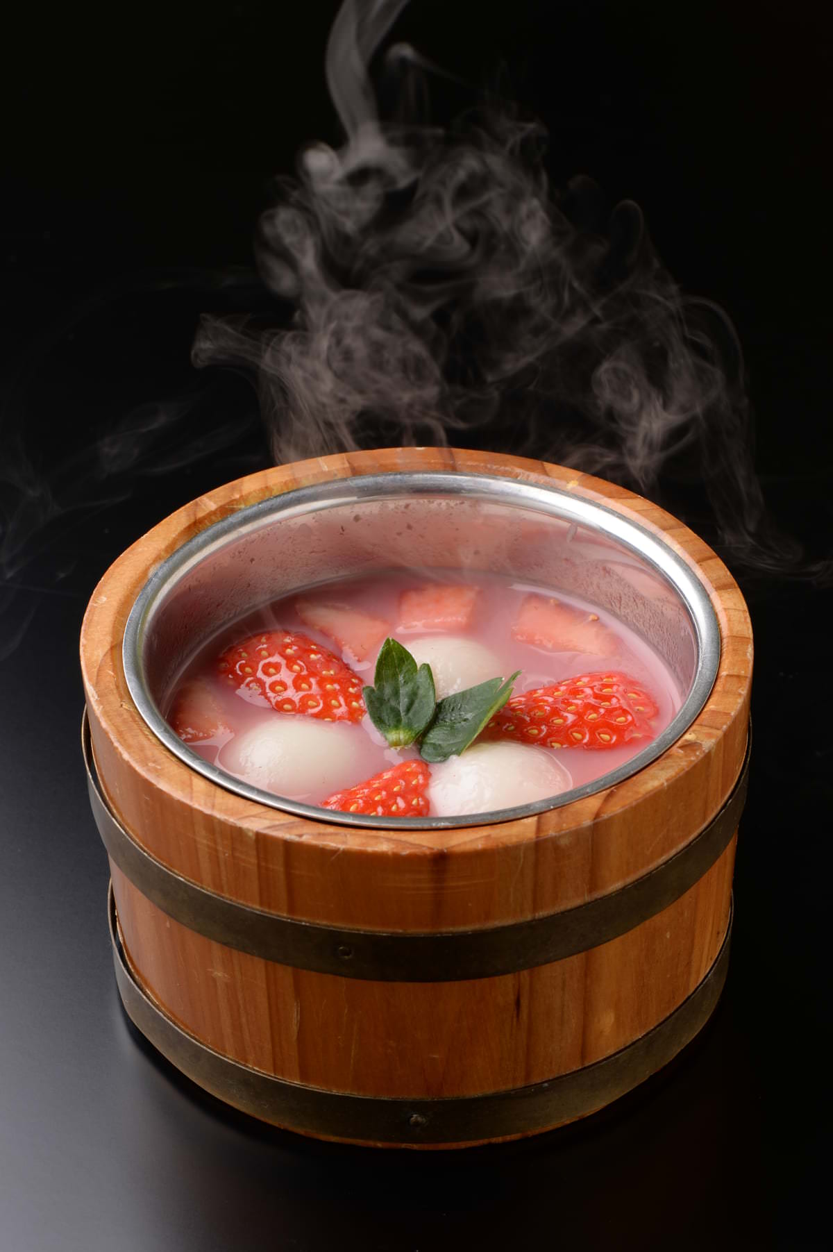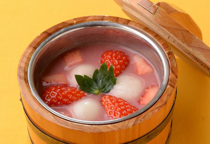 濃厚で甘酸っぱい温かい苺スープと、それに負けない黒ゴマ餡入りの白玉の出会いが驚きの味わいに仕上げられています。