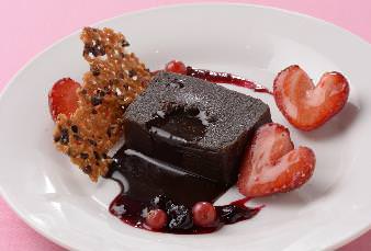 フランス・ヴァローナ社のチョコレート100%を贅沢に使用したフォンダンショコラに、苺のソース、フランボワーズ、赤すぐりを添え、華やかに仕上げられた「プレミアム フォンダンショコラ」