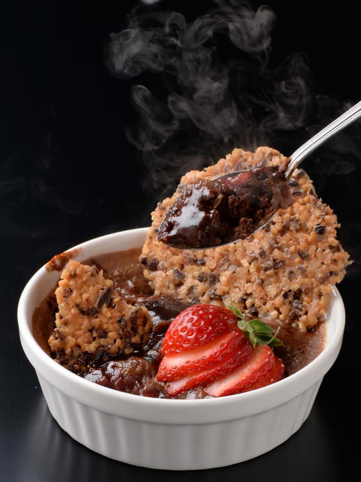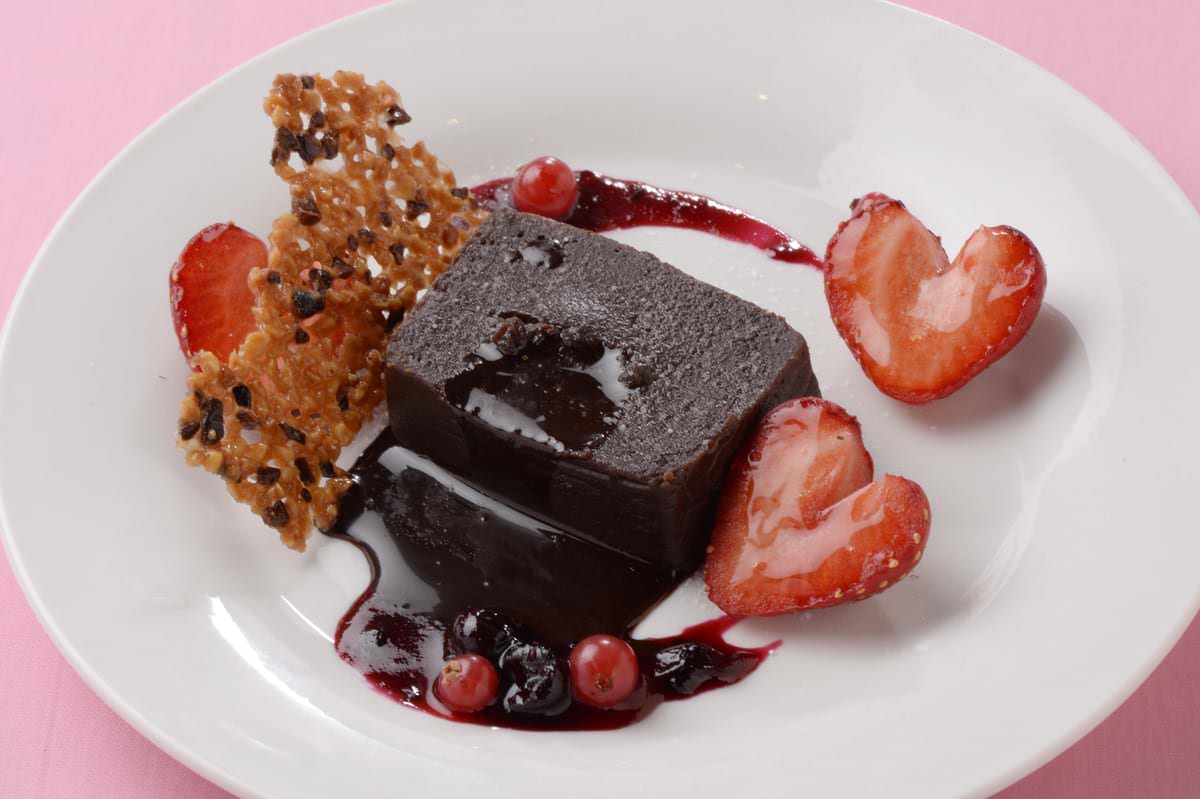 甘みと苦みのバランスが程良く調和したフォンダンショコ ラの中から、とろりととろけだす温かいチョコレートの味わいと香りが口いっぱいに広がり、濃厚なショコラの味わいを苺の甘酸っぱさが引き立てます。