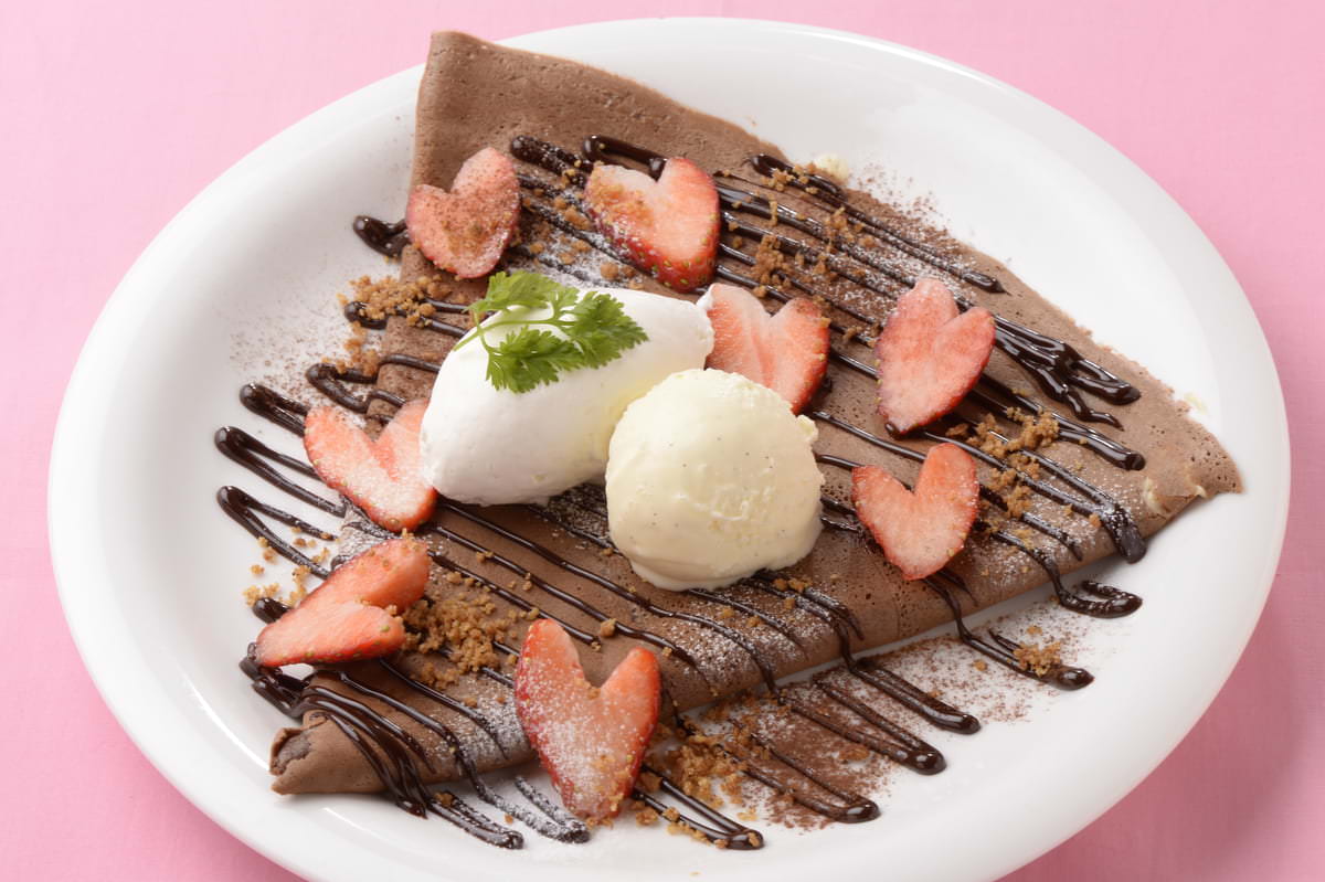クレープの上にハートにカットした苺を散りばめ、チョコレートソース、ココアパウ ダー、粉糖、自家製グラハムビスケット、さらにバニラアイス、生クリームをトッピング。