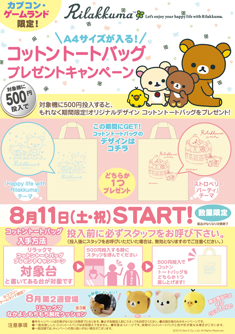 カプコン・ゲームランド限定「コットントートバッグ プレゼントキャンペーン」&「リラックマ なかよしもちもち腕枕クッション」