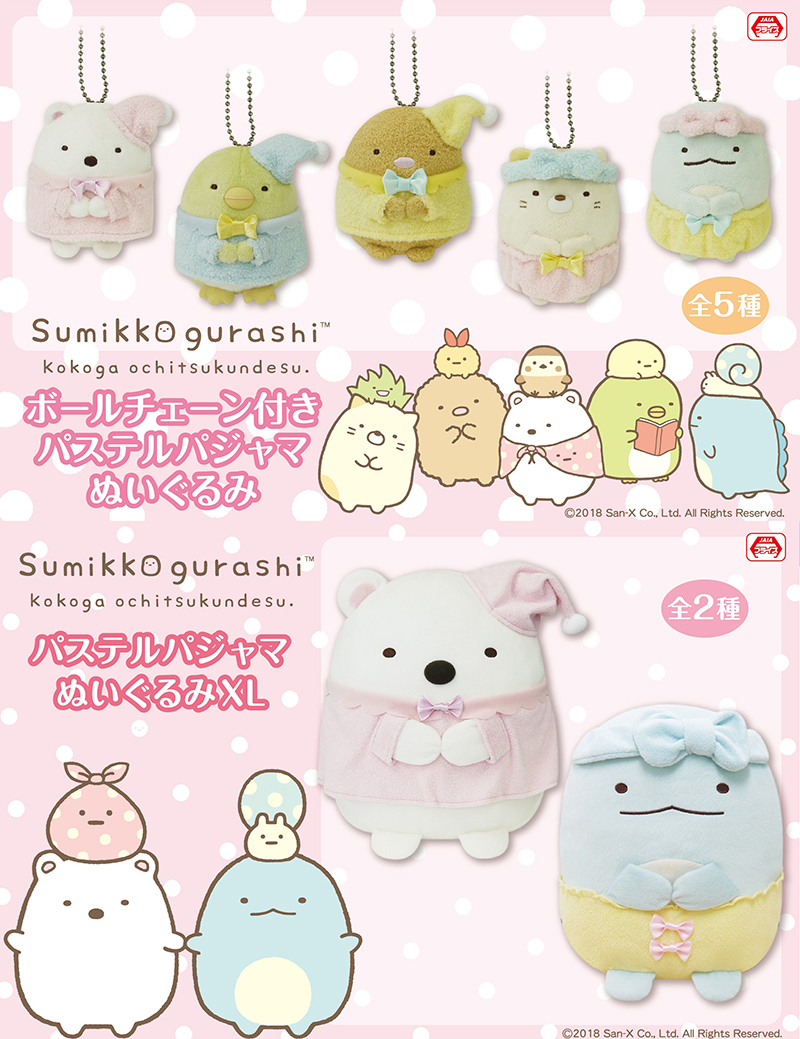 パジャマスタイルのすみっコぐらしのぬいぐるみはキーチェーンつきタイプとXLサイズの2種類が登場です。