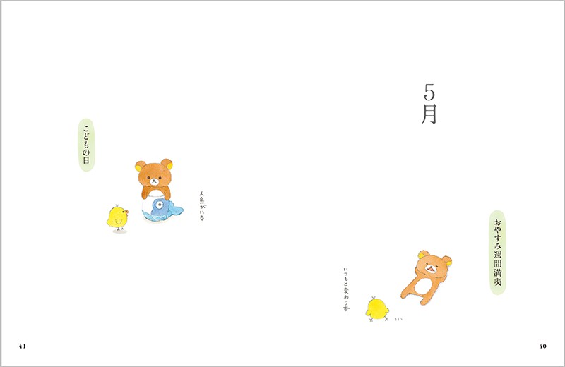 5月には、ゴールデンウィークやこどもの日を楽しむリラックマ&キイロイトリの、のどかな様子が描かれています。