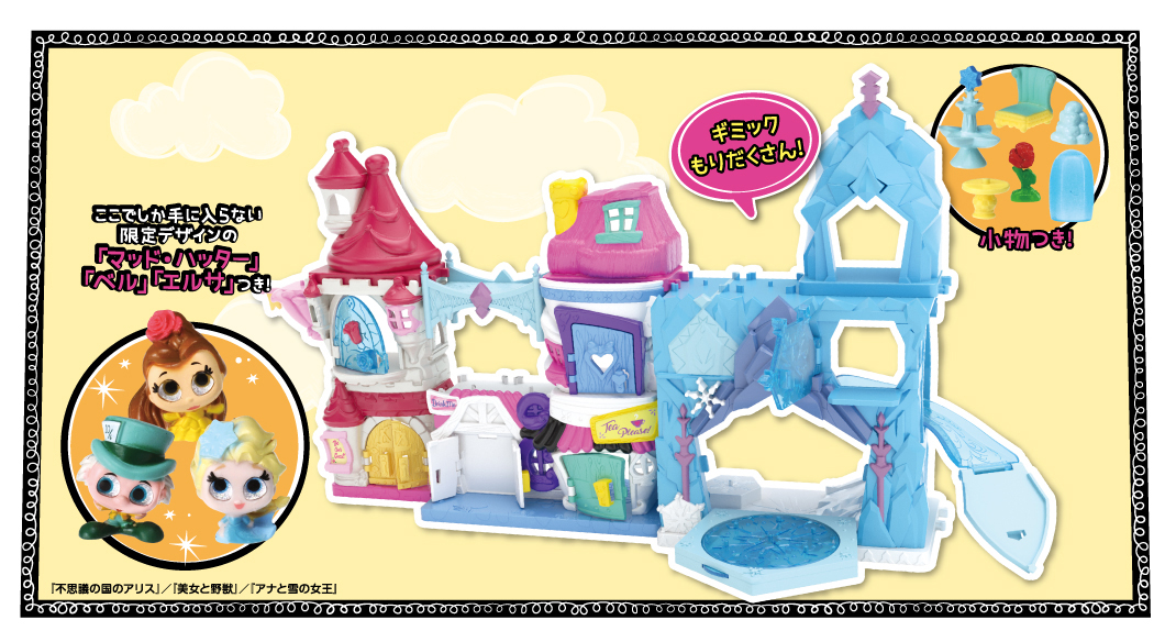 限定ドアフィグは、『ふしぎの国のアリス』のマッド・ハッター、ディズニーアニメーション映画『美女と野獣』のディズニープリンセス ベル、『アナと雪の女王』のエルサ。