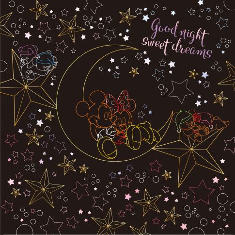 「ミッキーマウス」&「ミニーマウス」が輝く月や星と一緒に浮かんでいる幻想的なアート。