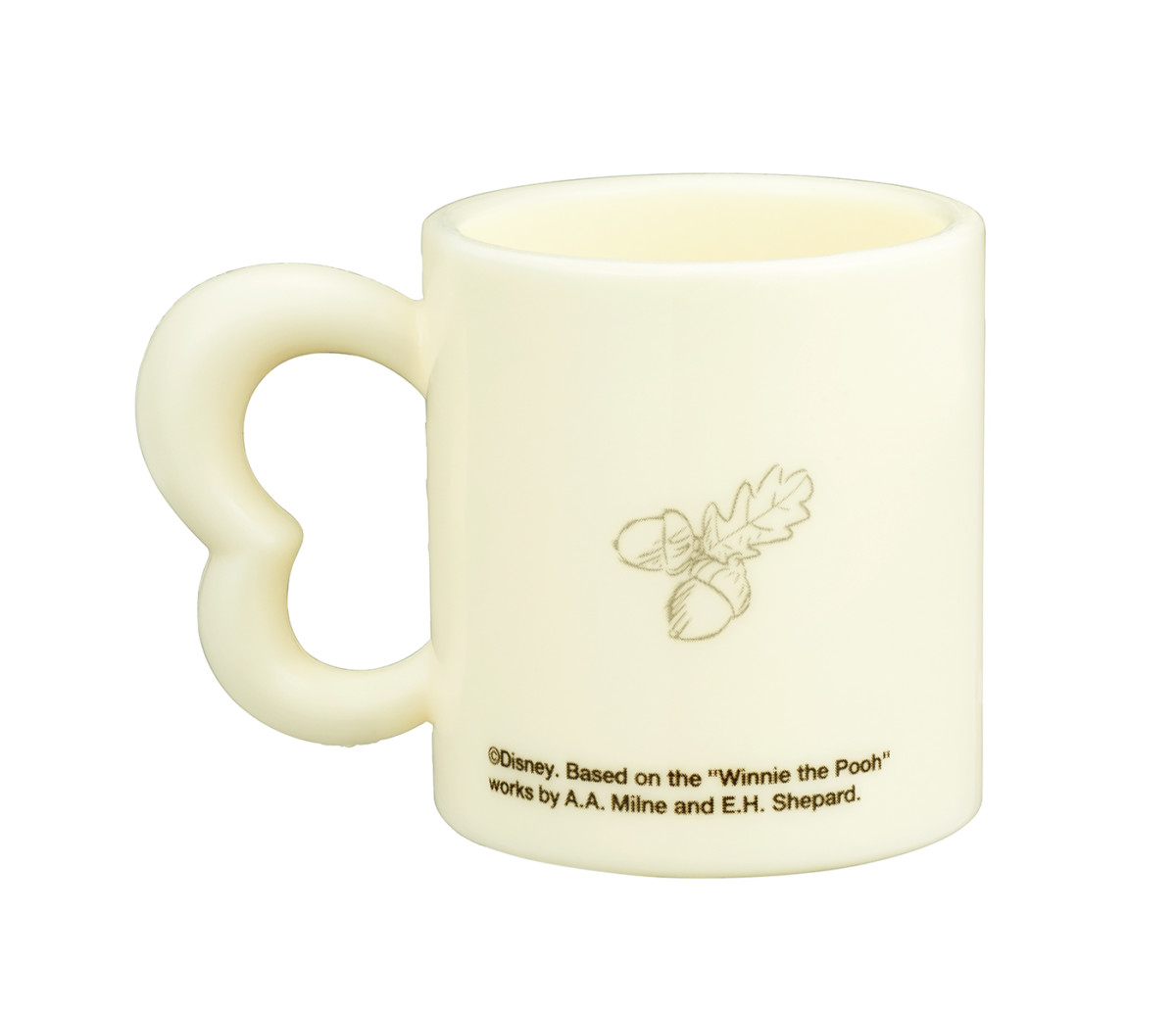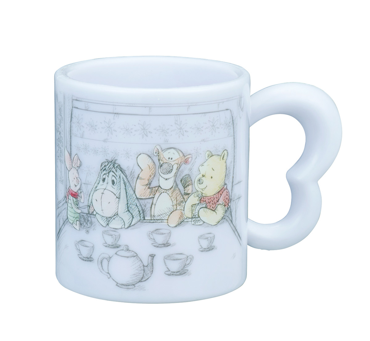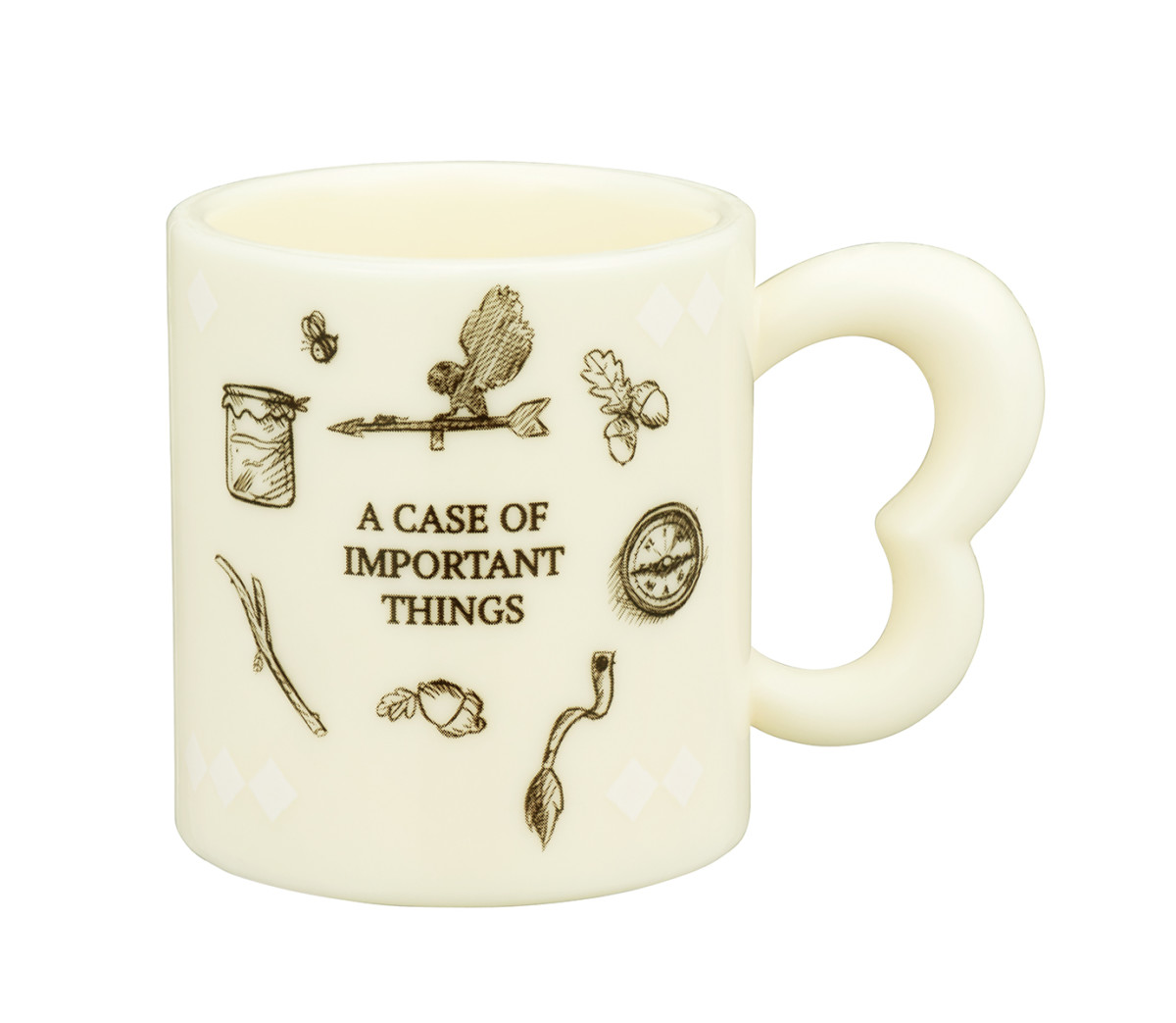 ハチミツや「イーヨー」のしっぽ、壊れてしまった風見鶏、コンパス、小枝などがモノトーンで描かれたミニマグカップ。