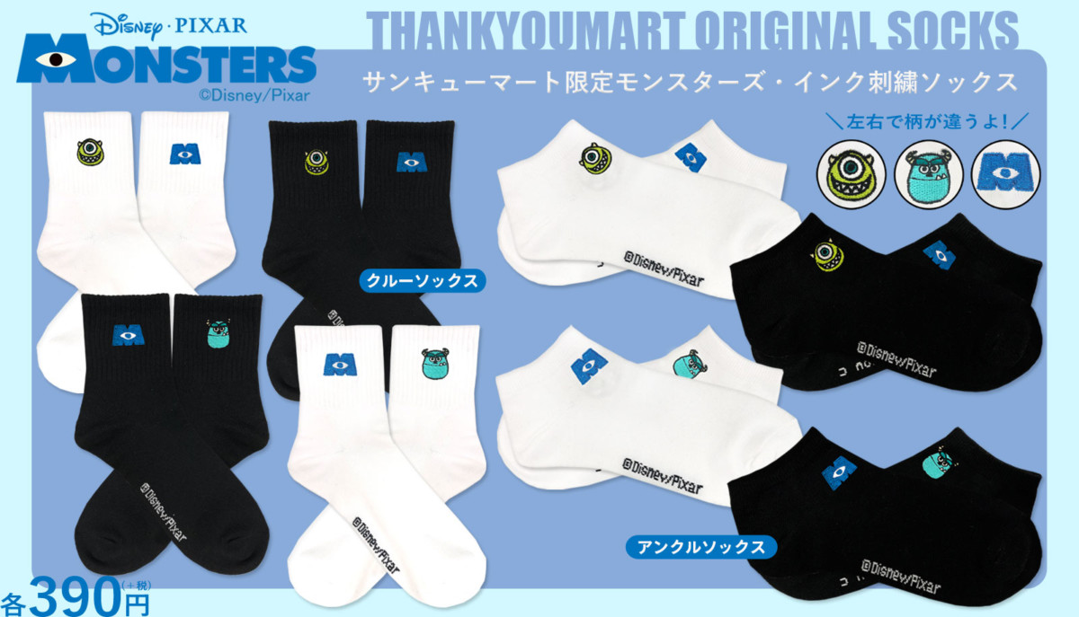 ディズニー/ピクサー映画『モンスターズ・インク』のロゴや、人気キャラクターの「マイク」、「サリー」の刺繍があしらわれたクルーソックスとアンクルソックスがラインナップ!