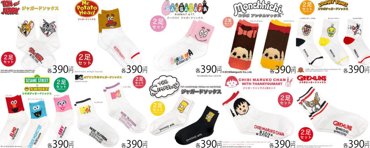 その他にも、「トムとジェリー」、「ミスターポテトヘッド」、「バーバパパ」、「モンチッチ」、「ルーニー・テューンズ」、「セサミストリート」、「MTV」、「ザ・シンプソンズ」、「ちびまる子ちゃん」、「グレムリン」などのソックスも登場しています。