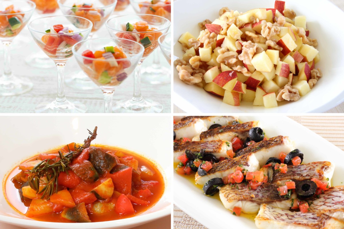 フランス料理のほか、「モッツァレラチーズとトマトのカプレーゼ」や「ブルスケッタ」などのイタリア料理、「鶏手羽元のチリンドロン風」などスペイン料理も並び、オードブルから魚・肉料理、デザートまで約30品が並びます。