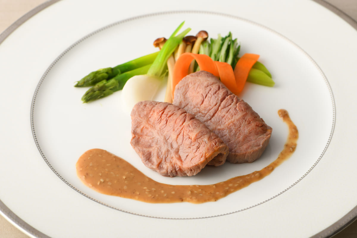香ばしく焼いた国産牛フィレ肉の赤ワインソース 蕗の薹のピューレと共に