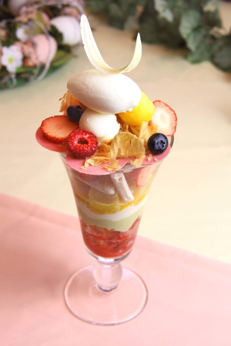 カラフルなフレッシュフルーツと卵や羽、鳥の巣などイースターをイメージした形のスイーツで春らしい色合いを表現したパフェ。