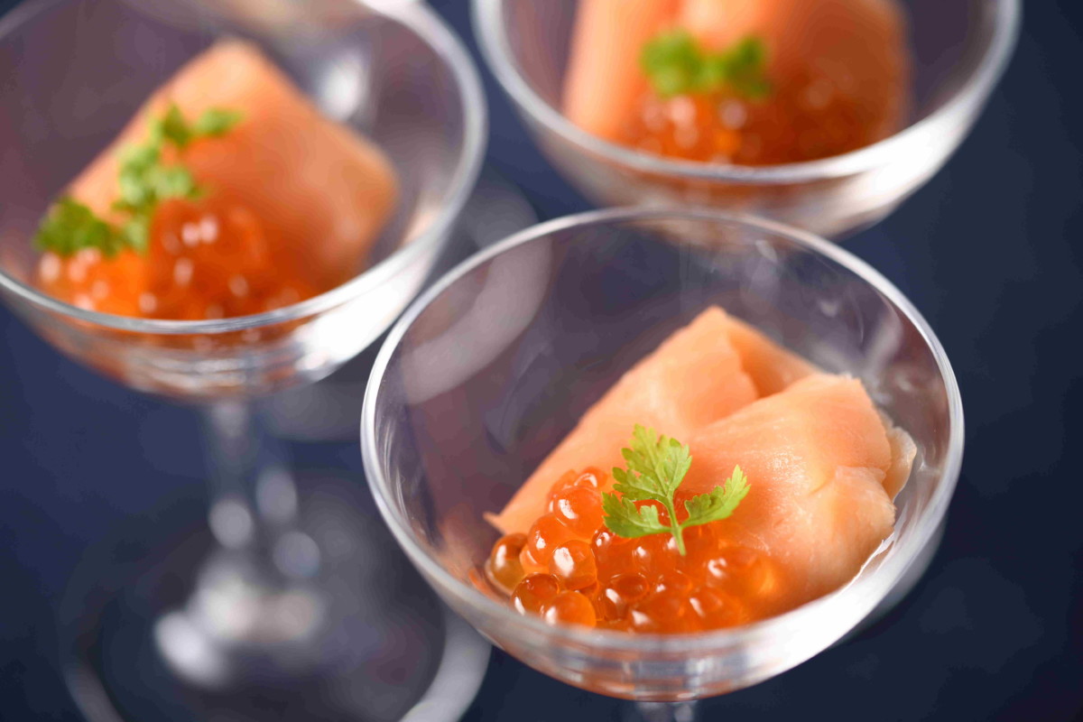 北海たこのタコポキ、船上一本〆秋鮭のカルパッチョとイクラのカクテル、イカと数の子の漁師漬け、帆立貝のカレー風味マリネ、知床どり胸肉とカボチャのサラダ仕立て、知床ポークのパテ・ド・カンパーニュ、松前漬け、塩辛、北海道産野菜も使用したサラダバー