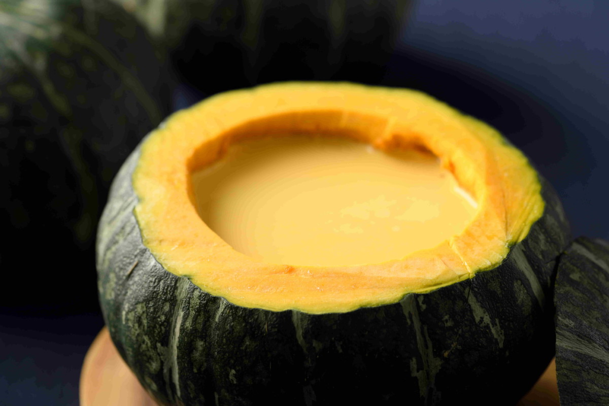 美瑛産カボチャの冷製クリームスープ、スープカレー、帆立稚貝の味噌汁