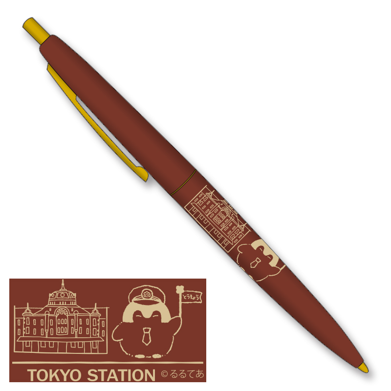 駅員コウペンちゃんと、東京駅がデザインされたボールペン。