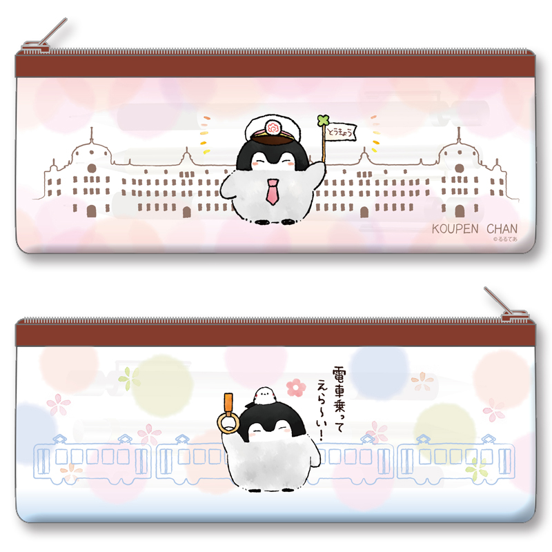 東京駅や電車、コウペンちゃんなどがデザインされたペンケース。
