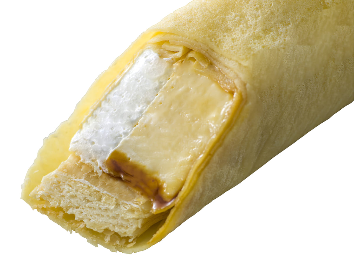 なめらかなプリンとサクサクのパイ生地、2つの食感が楽しめるクレープです。
