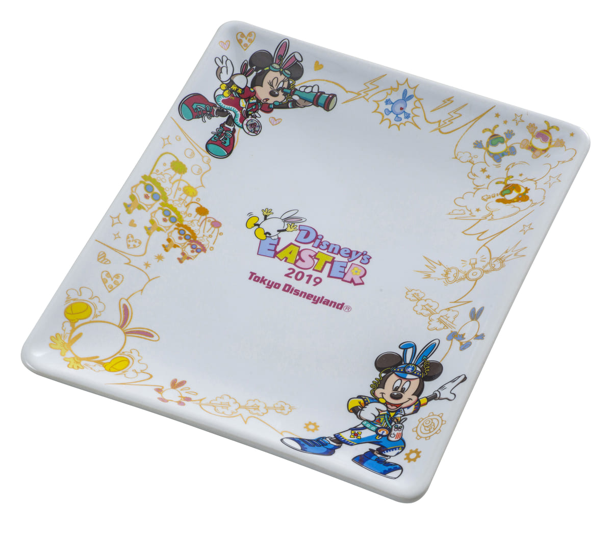 東京ディズニーランド“ディズニー・イースター2019”のミッキーマウスとミニーマウスがコーナーにデザインされたプレート付きのスイーツ。