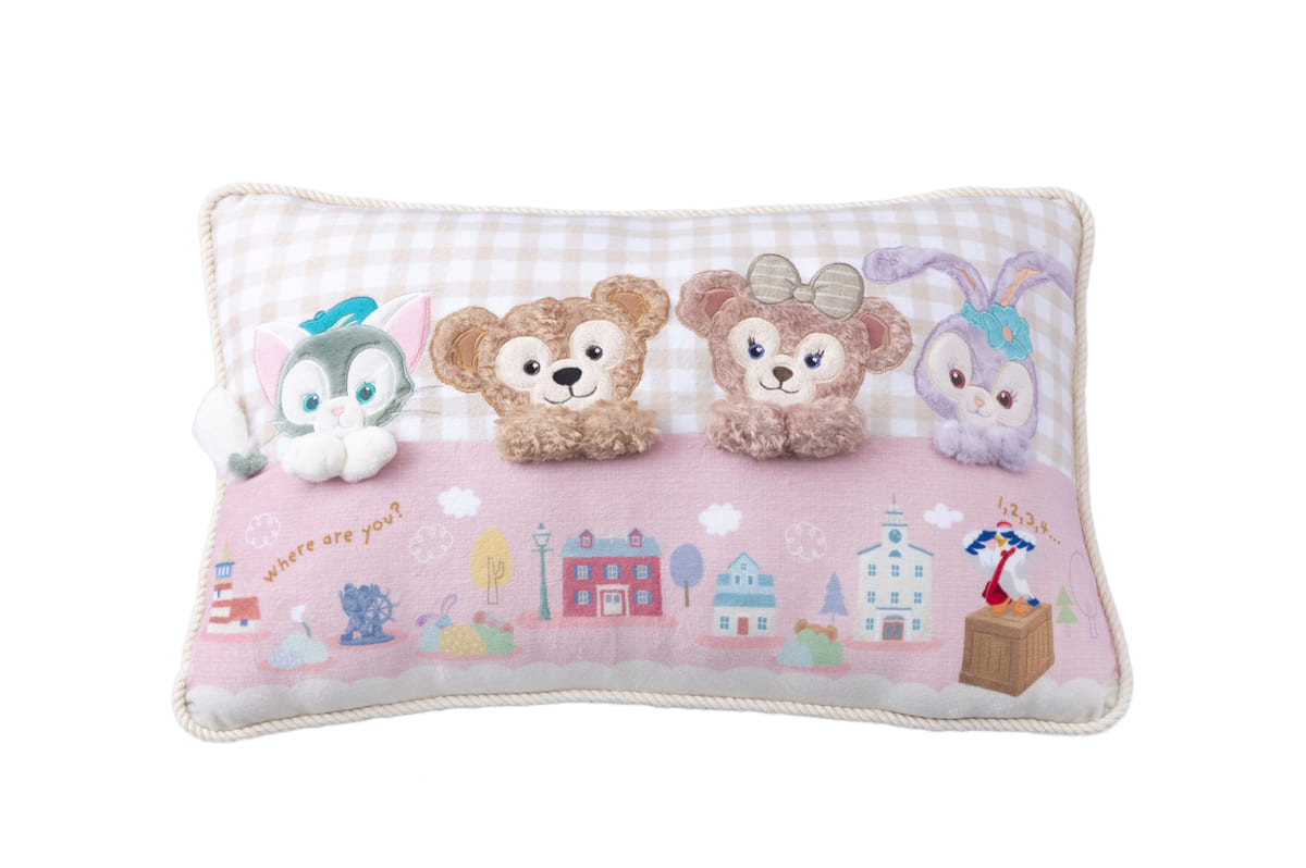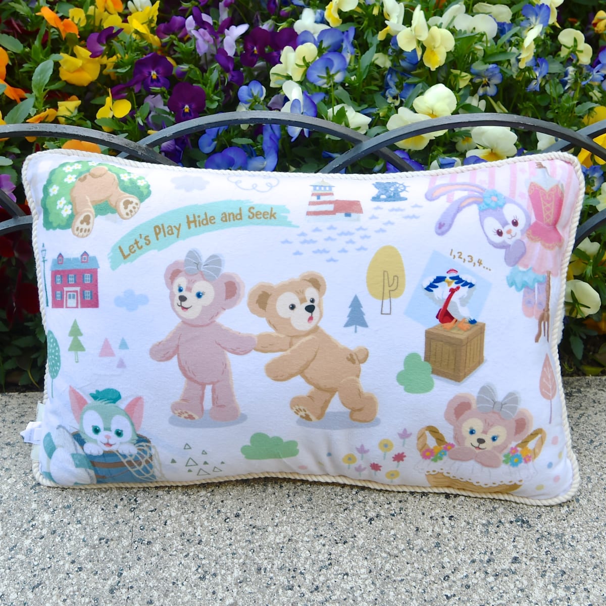 かくれんぼをしているダッフィー&フレンズのクッション。