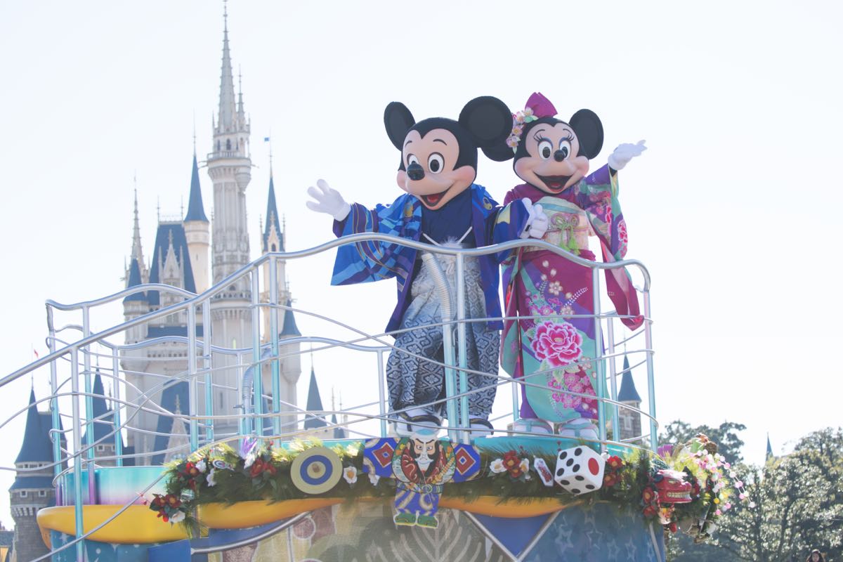 ミッキーマウスとミニーマウスをはじめとするディズニーの仲間たちが、華やかなお正月の衣装に身を包み、新年のご挨拶をします。