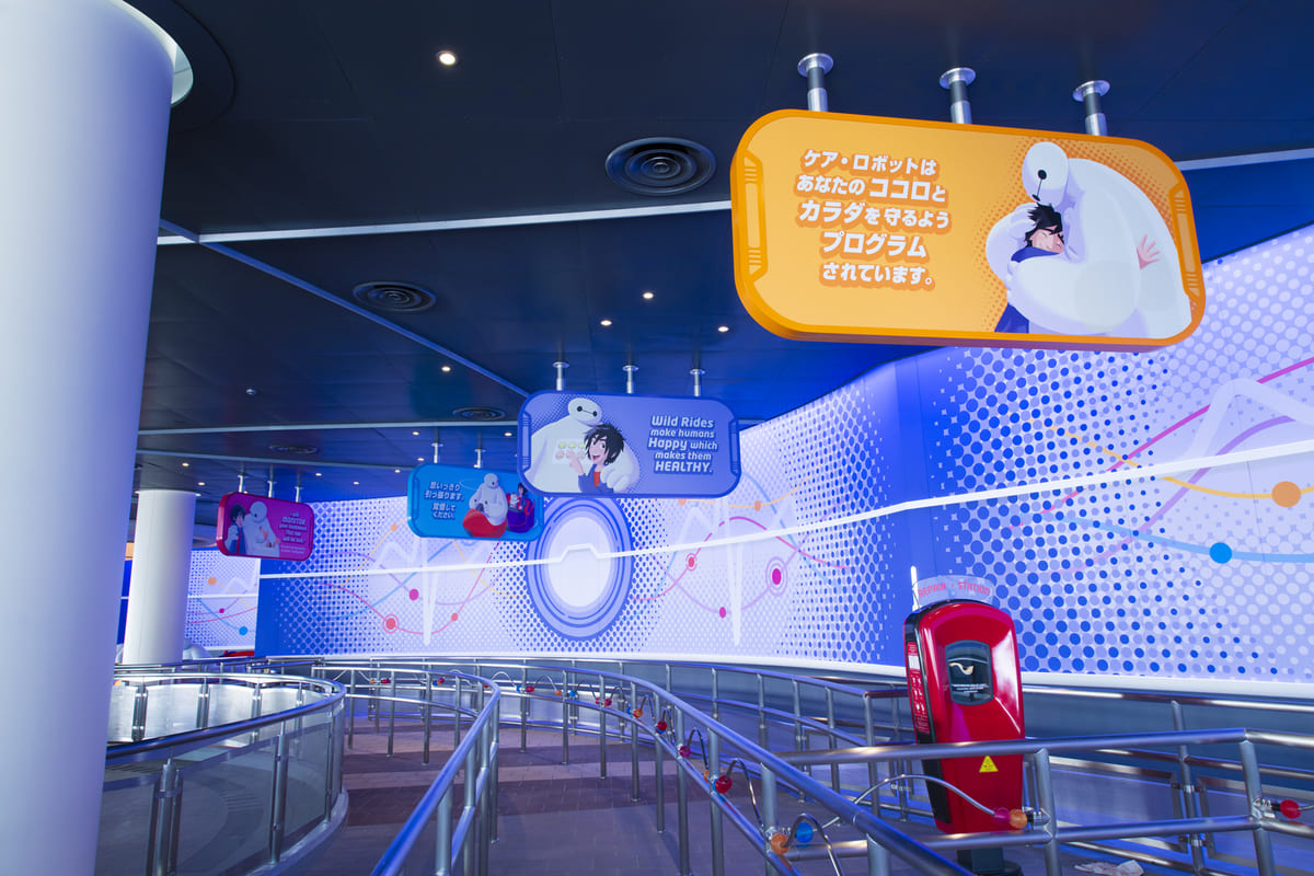 「ヒロ」のお気に入りのアップテンポな音楽が流れると、「ベイマックス」の仲間のケア・ロボットたちは予測不能な動きでゲストの乗ったライドを引っ張り、ゲストはその動きに想像以上に振り回されることに。