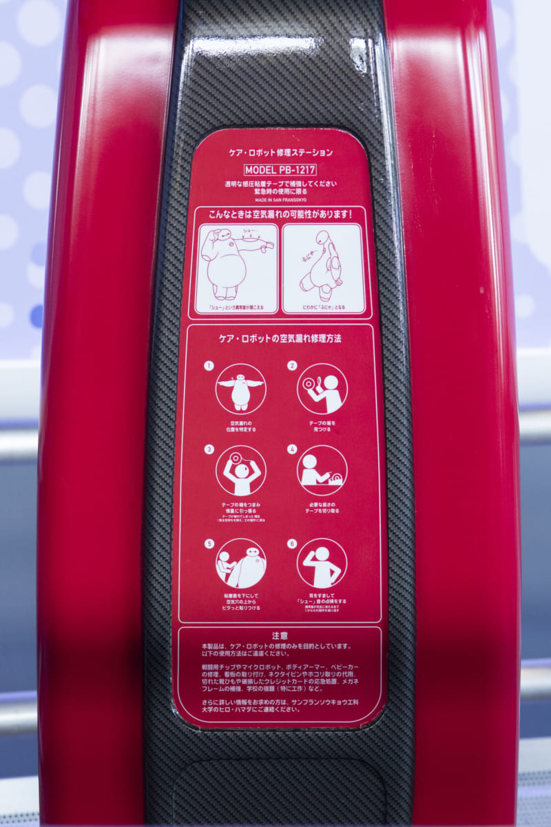「ベイマックス」を始めとするケア・ロボットに空気漏れが発生した際の緊急対応用の道具が保管されています。