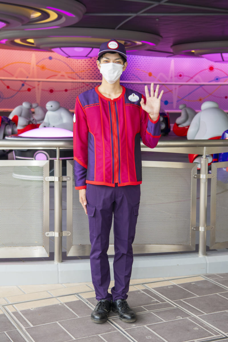 「ベイマックスのハッピーライド」のキャストは、赤と紫のコスチュームを身に着けています。