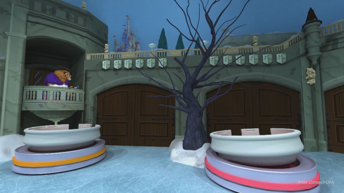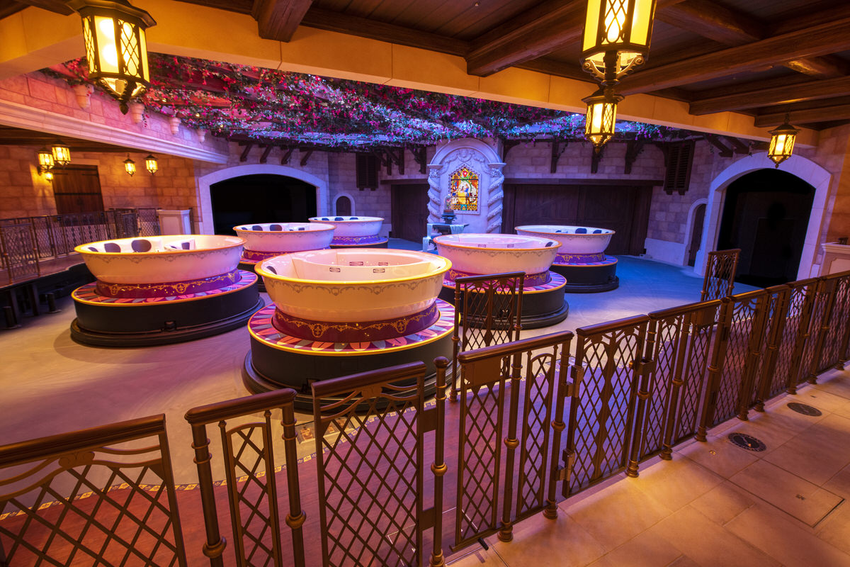 深皿型のライドに乗り、ディズニー映画『美女と野獣』の名シーンを映画の名曲とともに巡る日本オリジナルのライドタイプのアトラクション。