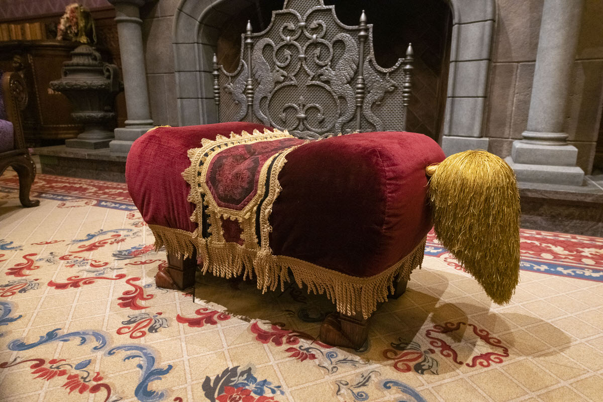 肘掛椅子の横に置かれた、 フットスツールは魔法にかけられる前は犬の姿をしていました。