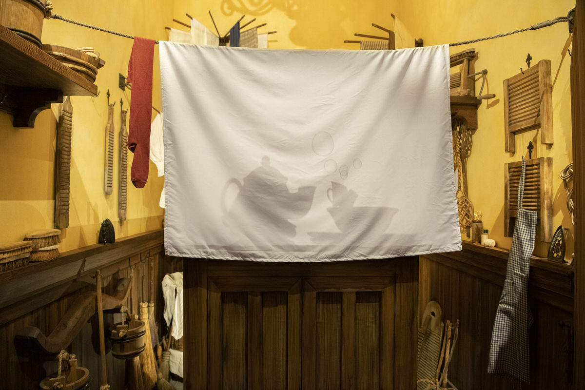 洗濯場のシーツの後ろに居る「ポット夫人」と「チップ」のシルエットが見えます。