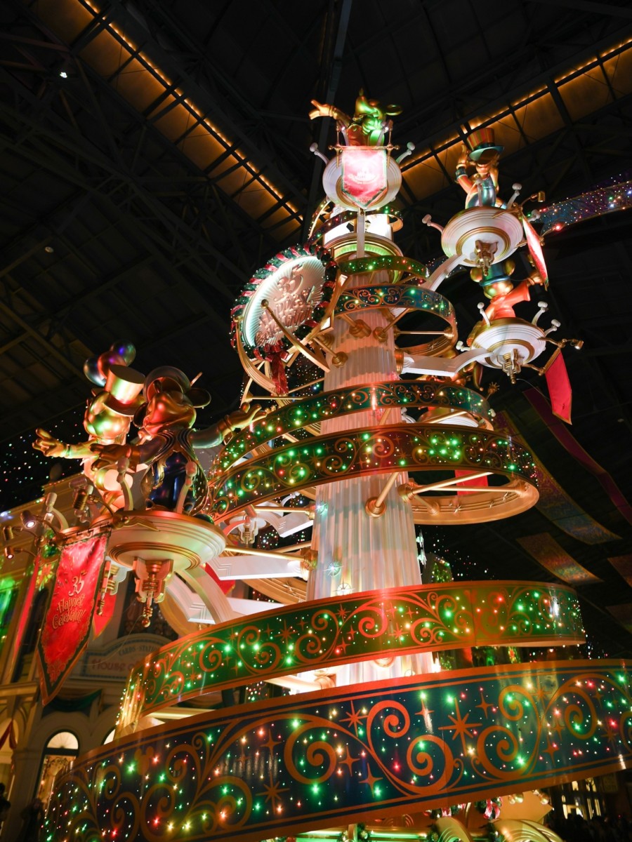 セレブレーションタワーもクリスマスカラーに彩られ、ワールドバザール全体がクリスマスの心温まる雰囲気に包まれます。