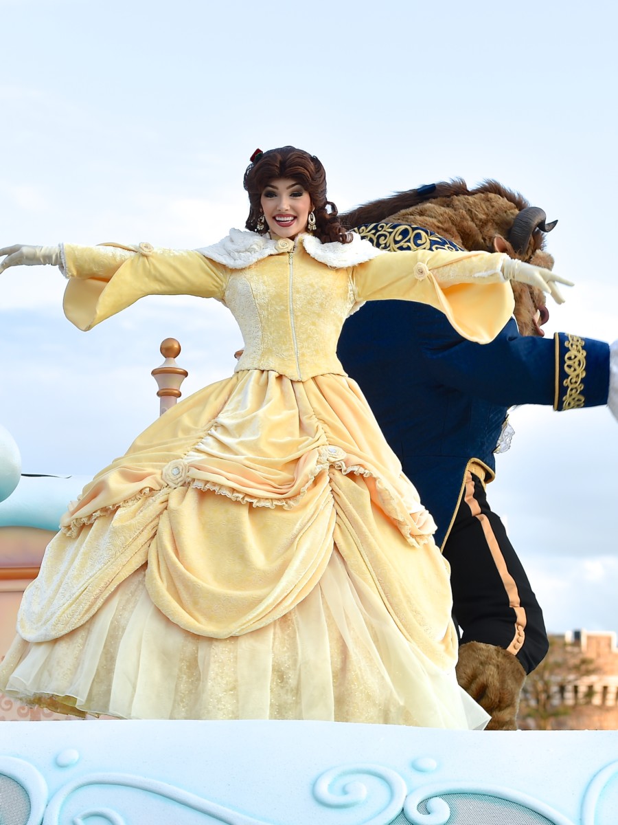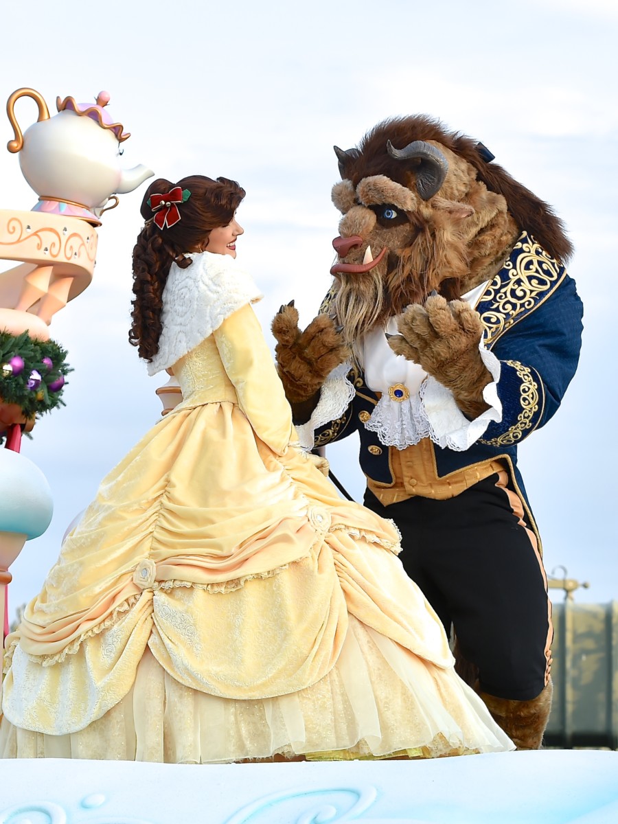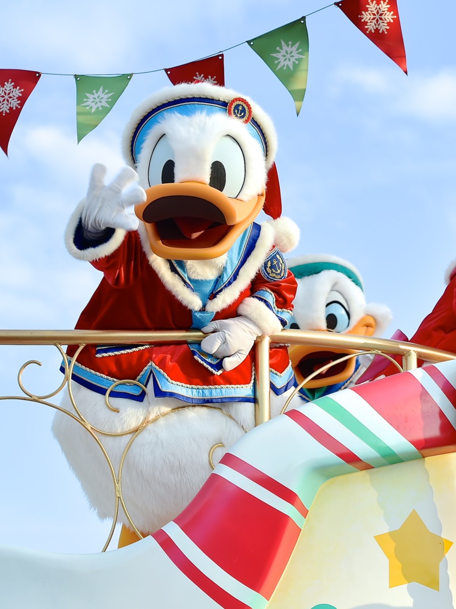 パレードでは、サンタクロースに扮したドナルドダックやデイジーダック、そして無邪気にはしゃぐ甥っ子のヒューイ、デューイ、ルーイたちと共に家族で過ごすクリスマスのフロートを皮切りに、ミッキーマウスとミニーマウスが大切な仲間たちと一緒に心躍るひとときを過ごすクリスマスや、ベルとビーストのロマンティックな恋人同士のクリスマスなど、7つのストーリーが楽しめます☆