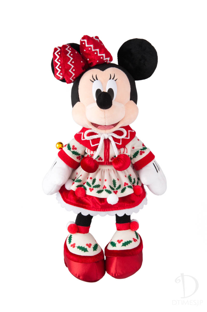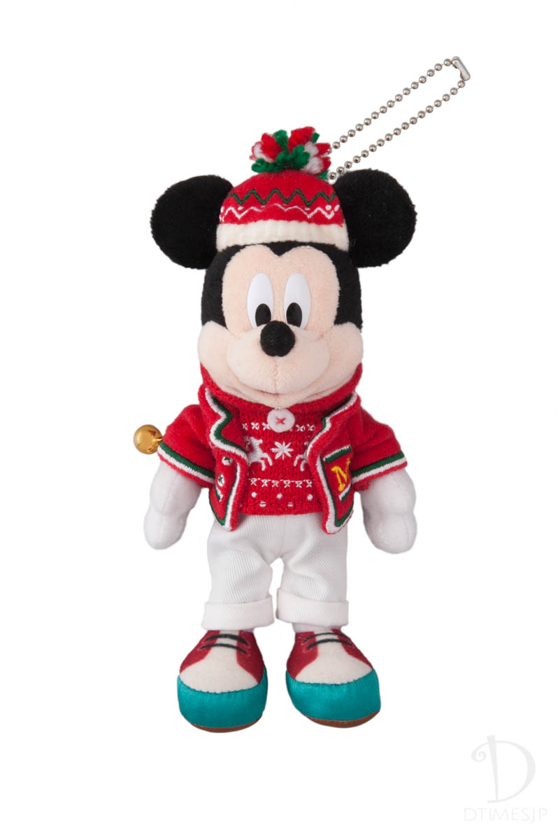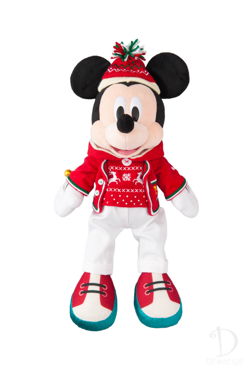 祝祭感あふれるスペシャルなクリスマスにふさわしい衣装を着たミッキーマウスのぬいぐるみ。