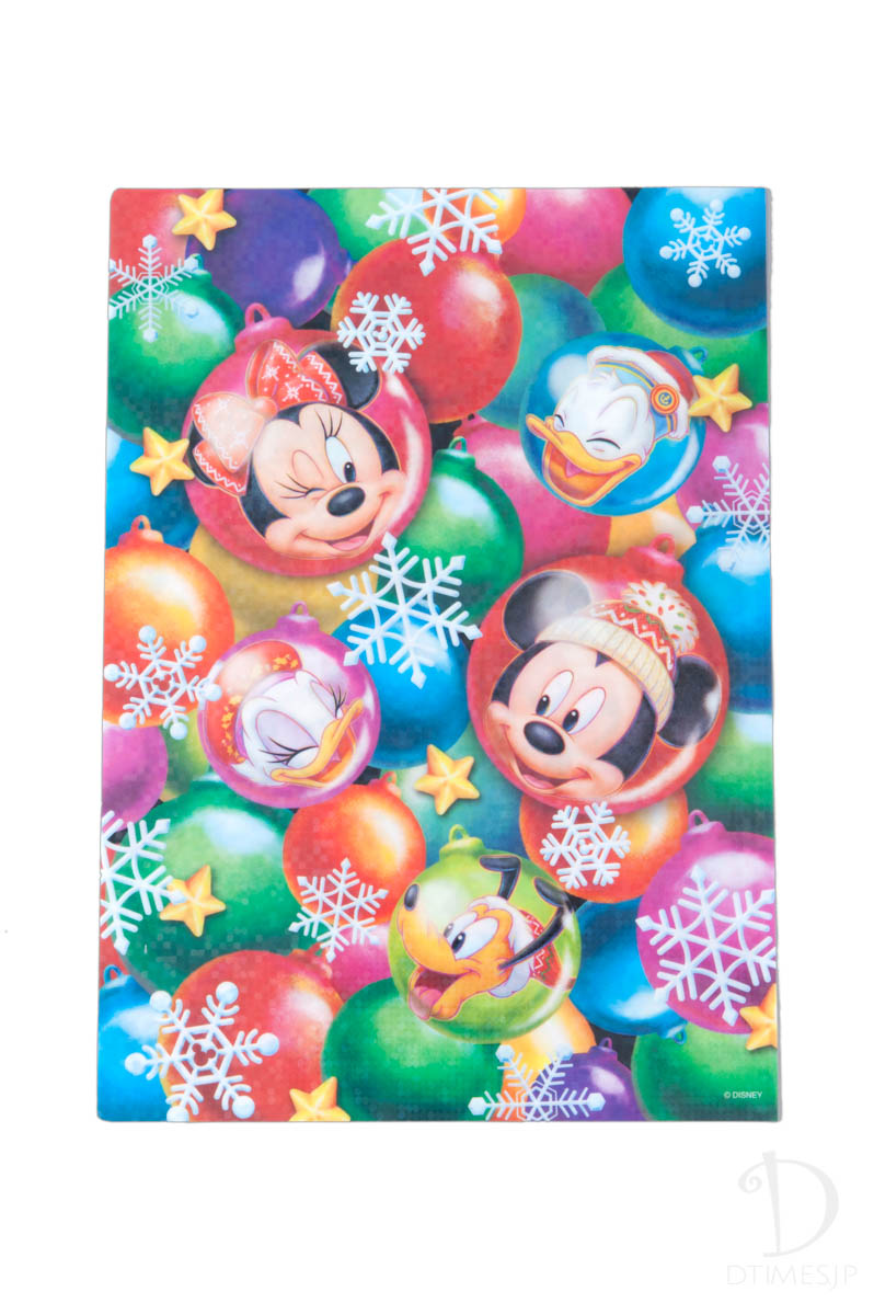 裏面には、たくさんのカラフルなオーナメントと、ミッキーマウスやミニーマウスの笑顔が描かれています!
